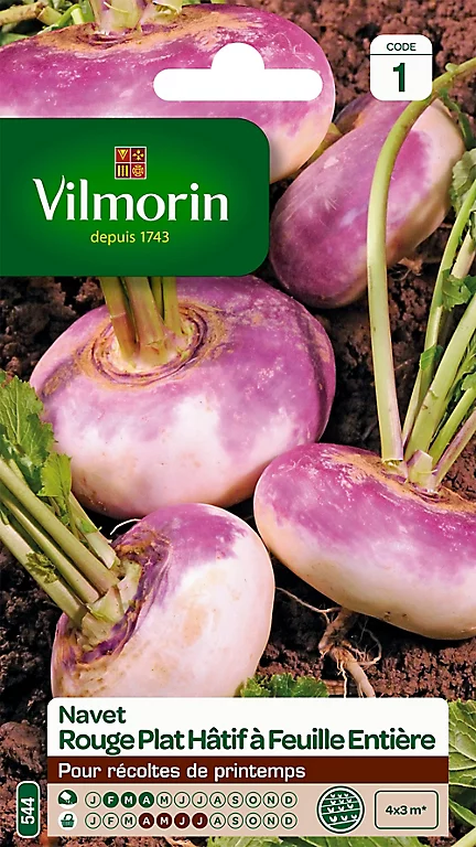 | Instructions pour plantation | Incorporer, lors de la préparation du sol, un produit contre les mouches des semis, du chou et autres insectes du sol. Pendant les chaleurs, croissance lente et manque d'eau rendent les navets fibreux. Penser à les arroser souvent pour qu'ils poussent vite et restent à la fois tendres et savoureux. Semis de mars à avril dispersé en rang large de 8 à 10 cm. Eclaircir à 10-12 cm. Arroser abondamment |