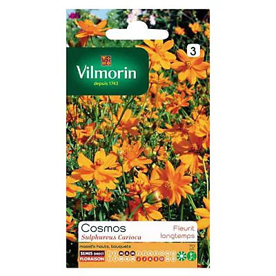 Cette variété de cosmos à floraison longue et abondante embellira vos jardins par son coloris chaud. Les grands cosmos sont de remarquables plantes de massifs et bordures poussant dans tous types de sols même secs et les fleurs produites sont magnifiques en bouquets et tiennent très bien.